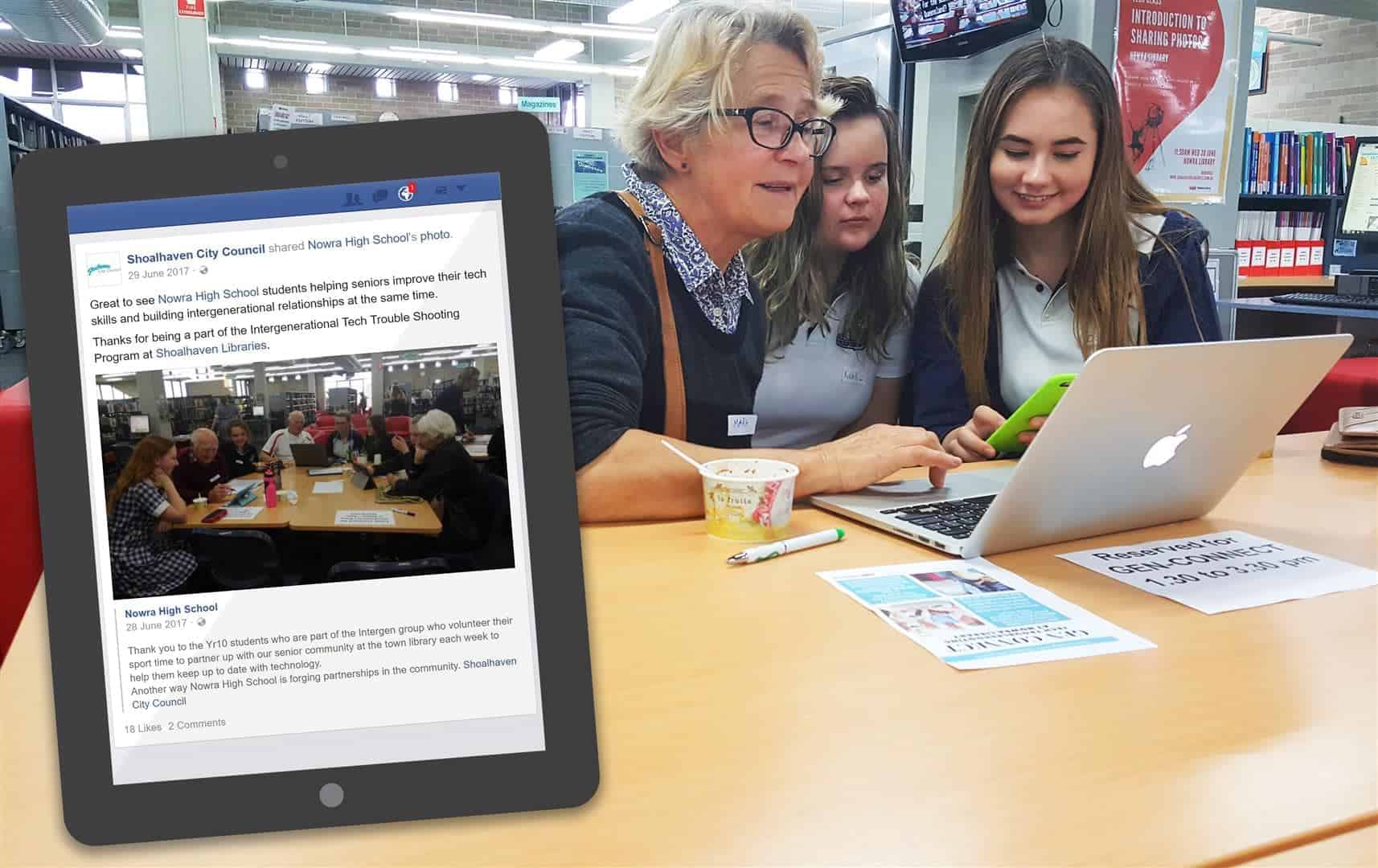 As more services and community information have become available primarily online, it became clear that technology assistance for older people was necessary. Seniors increasingly demanded assistance in accessing and using technology at Shoalhaven Libraries. To improve technology skills and to tackle social isolation and loneliness, Shoalhaven Libraries partnered with Shoalhaven City Council and the Nowra High School to start the Gen Connect programme.