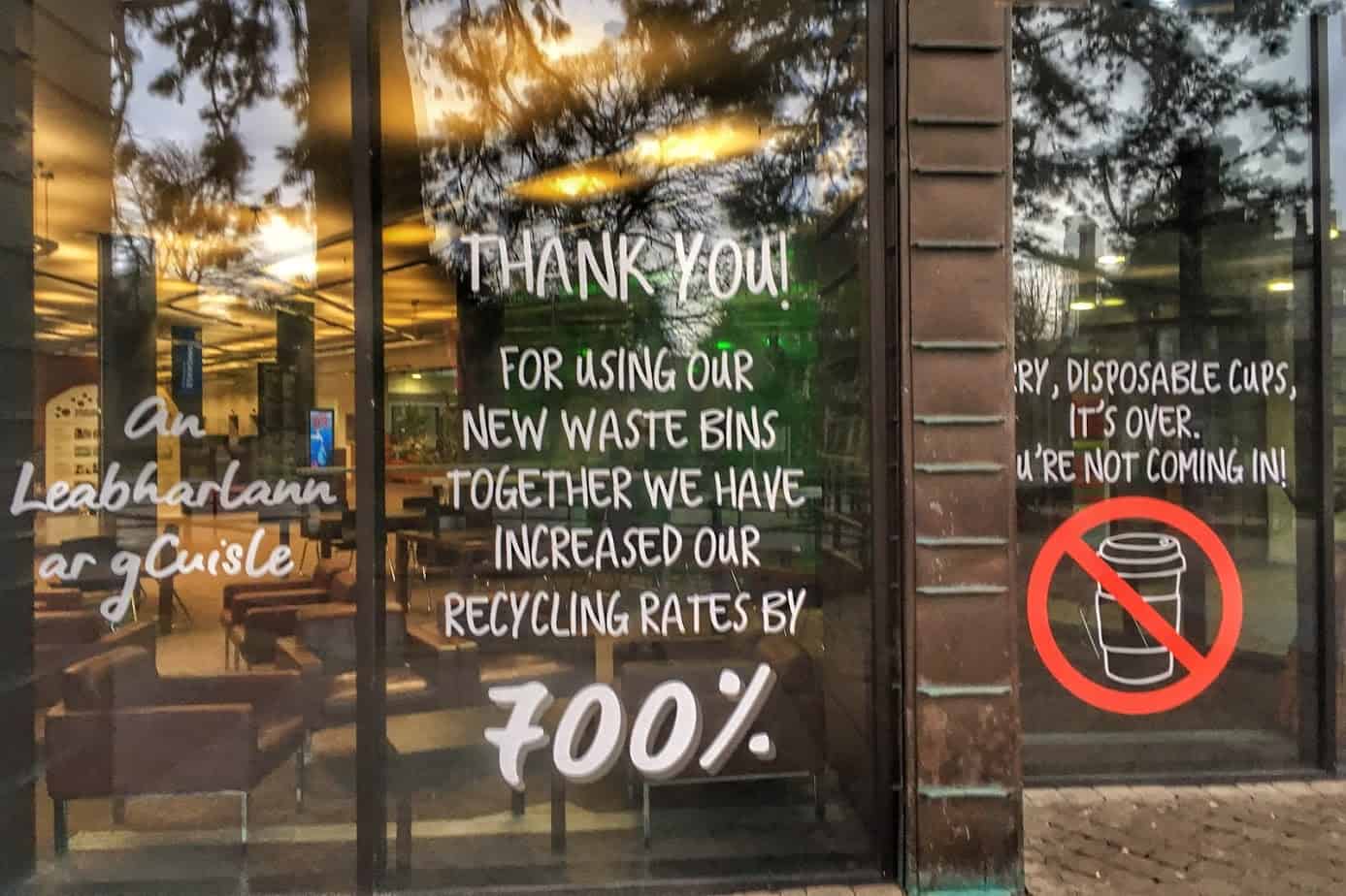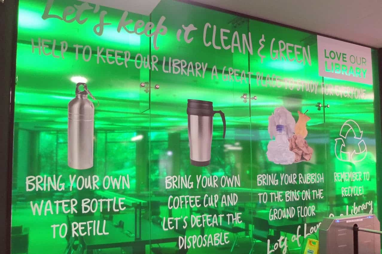 The Library also introduced a waste management and recycling programme. All bins were removed from staff offices and student areas, and two recycling stations were placed on the ground floor of the library. Single use cups were banned and alternative bamboo mugs and sugar cane bottles went on sale in the library. Water fountains were revamped, and students were encouraged to bring and refill their own water bottles. A dishwasher was purchased so catering for conferences and meetings in the Library could be provided without single-use products.
